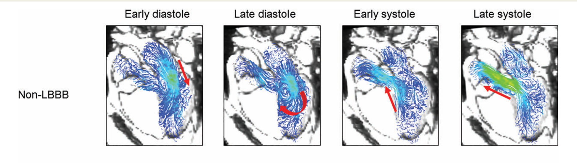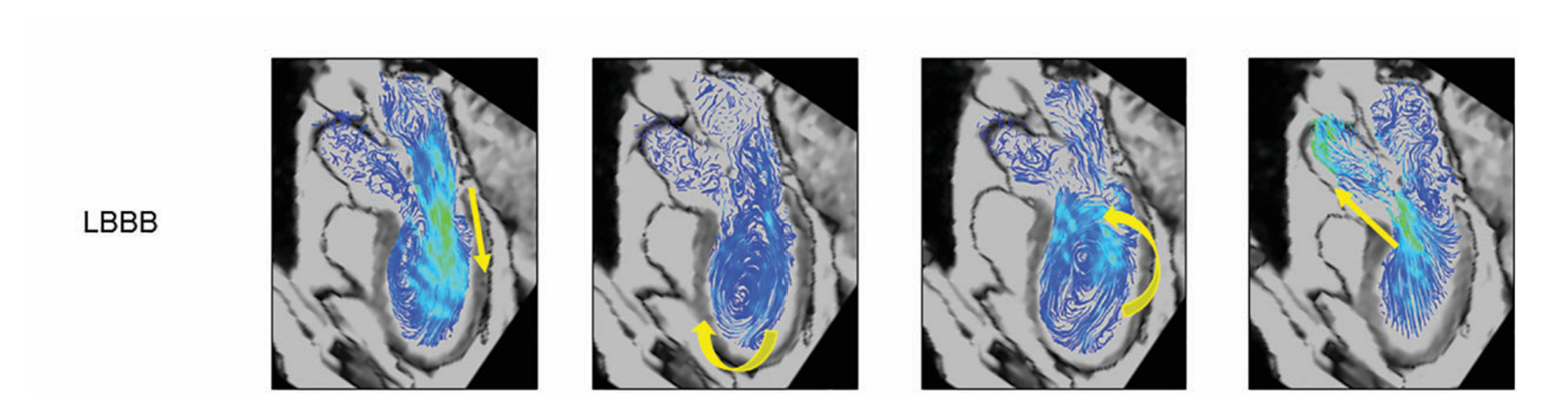 In LBBB, the pathlines show delayed and uncoordinated filling, with vortices forming off-centre and persisting longer than normal. As systole begins, the flow remains disorganised, and by late systole the ejection jet is weaker and poorly aligned. These pathlines illustrate how LBBB disrupts the timing and efficiency of blood transport through the ventricle.