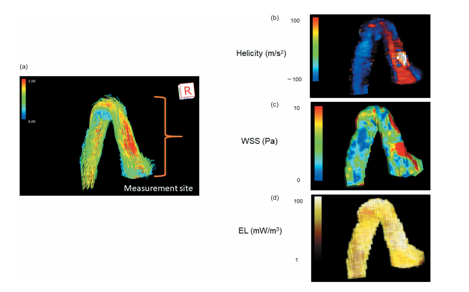Helicity is the local strength of the helical motion of blood flow. In simple terms, helicity measures how intensely blood flow is twisting or spiraling as it travels. Helicity is a key indicator of flow efficiency. While healthy blood flow often has a gentle spiral, excessive helicity contributes to conflicted blood flow. This conflicted flow, along with vorticity (swirling), generates friction within the blood, resulting in a quantifiable metric known as Energy Loss (EL).