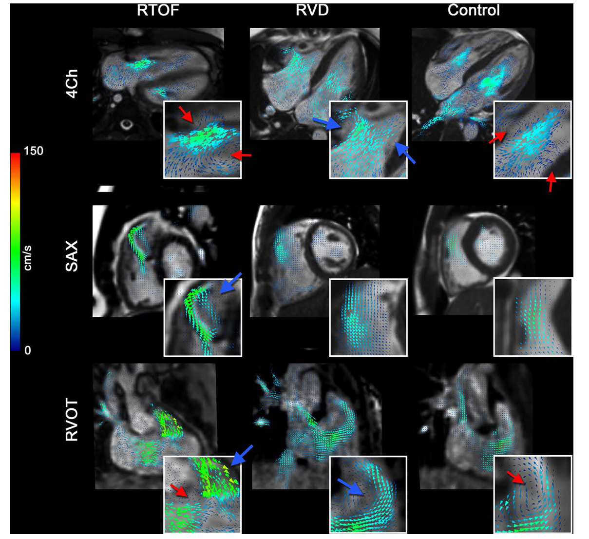 This figure visualises how helicity and vorticity differ across the right ventricle in repaired Tetralogy of Fallot (RTOF), right-ventricular dilation (RVD), and healthy controls. Velocity vectors are superimposed onto cine MRI, with blue arrows marking regions of strong vortex structure and red arrows marking weaker rotational flow.