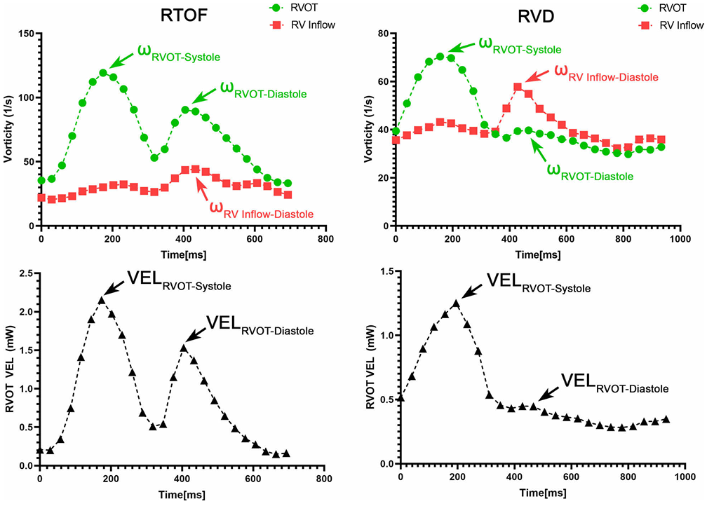 In healthy hearts, blood entering the right ventricle forms a stable, organised ring shaped vortex during filling. This structure supports efficient transport toward the outflow tract and minimises energy loss. In rTOF, pulmonary regurgitation generates a dominant, abnormal vortex in the right ventricular outflow tract. This disrupts normal flow organisation, leading to increased rotational instability and reduced efficiency. RVD patients show altered vortex formation as well, though typically less severe than in rTOF.